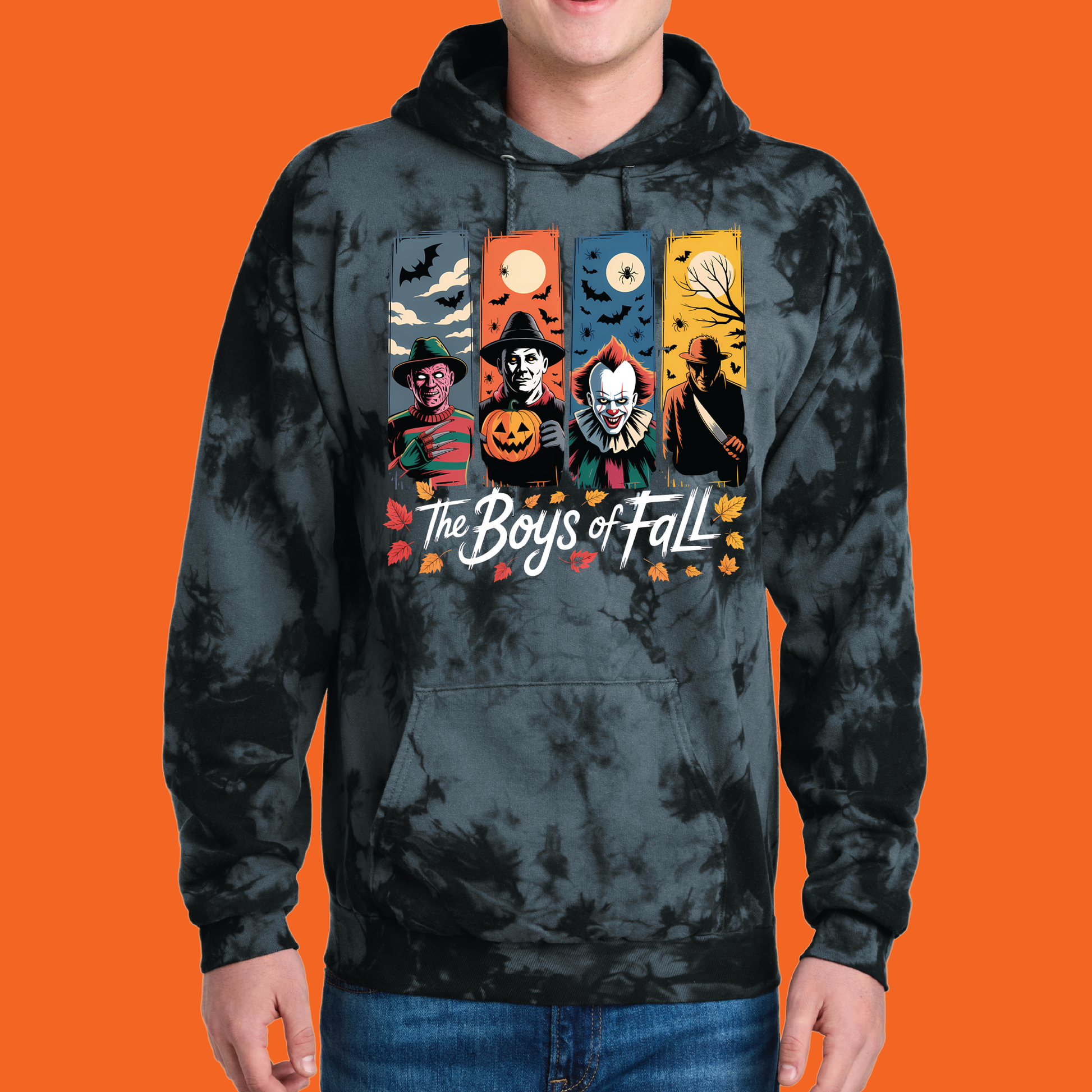 Get cozy with your favorite creeps this fall with The Boys of Fall graphic hoodie. This design features four classic horror characters reimagined for the autumn season. This shirt is the perfect pick for horror movie marathons, haunted hayrides, and Halloween fun.